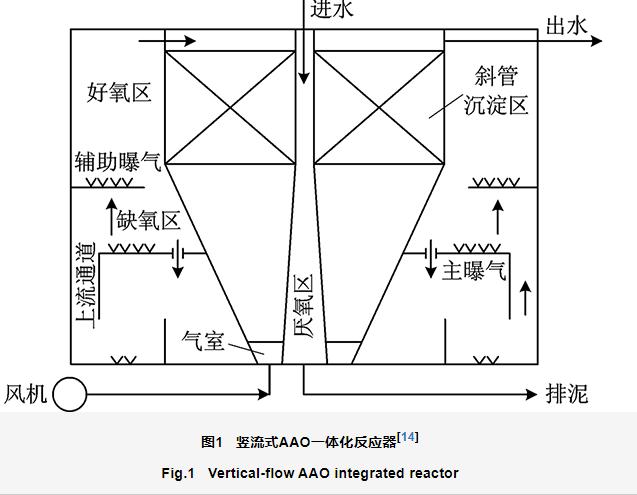 整合工藝流程、縮小占地面積是一體化AAO工藝亟待解決的問題。肖炘圻等[14]設(shè)計了豎流式一體化反應(yīng)器(圖1)處理農(nóng)村生活污水,該反應(yīng)器將常規(guī)AAO工藝中單獨設(shè)置的厭氧區(qū)、缺氧區(qū)、好氧區(qū)和沉淀區(qū)整合為一體,考察了HRT和好氧區(qū)溶解氧(DO)濃度對處理效果的影響。結(jié)果表明,HRT為8 h,DO濃度為2.5 mg/L時,出水COD和NH3-N、TN、TP濃度均可以滿足GB 18918—2002《城鎮(zhèn)污水處理廠污染物排放標準》一級A標準。針對一體化工藝中污泥處理處置問題,任宏洋等[15]將AAO系統(tǒng)中剩余污泥臭氧化處理,研究了處理后污泥減量效果和污水處理效能,考察了污泥全部回流至厭氧區(qū)、等比例回流至厭氧區(qū)和缺氧區(qū)、全部回流至缺氧區(qū)3種回流方式下累積排泥量,發(fā)現(xiàn)耦合后的AAO系統(tǒng)排泥量分別下降了51.3%、49.8%、47.6%;另外研究發(fā)現(xiàn),臭氧化污泥回流提高了污泥沉降性和系統(tǒng)的脫氮能力,且污泥回流區(qū)域?qū)P的去除率有較大影響,確定等比例回流臭氧化污泥至厭氧區(qū)和缺氧區(qū)為最佳回流方式。
